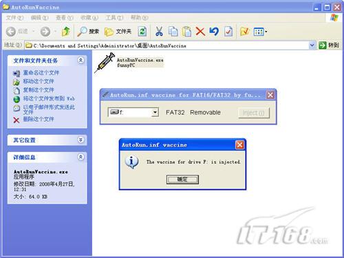 第三步:最后點(diǎn)右邊的inject按鈕實(shí)現(xiàn)U盤(pán)自動(dòng)免疫,出現(xiàn) the vaccine for drive f: is injected 說(shuō)明U盤(pán)免疫成功,經(jīng)過(guò)處理U盤(pán)將不會(huì)再感染自動(dòng)播放類(lèi)型的U盤(pán)病毒了。(如圖11)