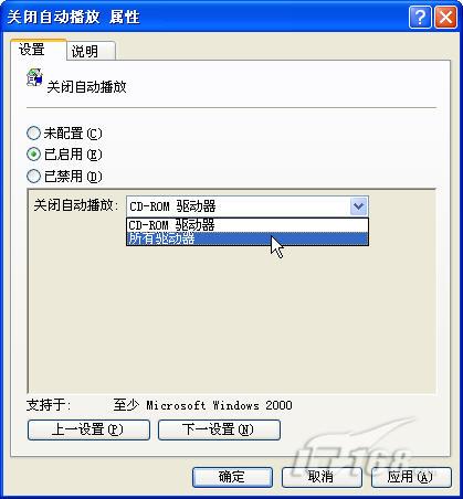 第三步:單擊“設置”選項卡,選中“已啟用”復選鈕,然后在“關閉自動播放”框中單擊“所有驅動器”,單擊“確定”按鈕,最后關閉“組策略”窗口。當然模式是CD-ROM驅動器,如果僅僅保持默認的話我們將無法杜絕U盤的自動播放。(如圖4)