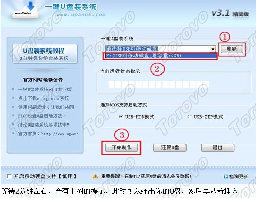 安裝完成后,雙擊打開一鍵軟件,畫面如下圖:插入U盤點擊“刷新”按鈕。點擊下拉菜單,選擇你的U盤,點擊“開始制作”按鈕(如圖所標(biāo),1.2.3步驟)