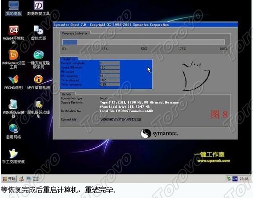 至此,用一鍵u盤安裝操作系統(tǒng)完畢!你可以忘掉沒有光驅(qū)無法安裝操作系統(tǒng)的煩惱了。值得一提的是,由于整個過程都是在硬盤里讀取數(shù)據(jù),所以在安裝速度上比用光盤安裝快很多。