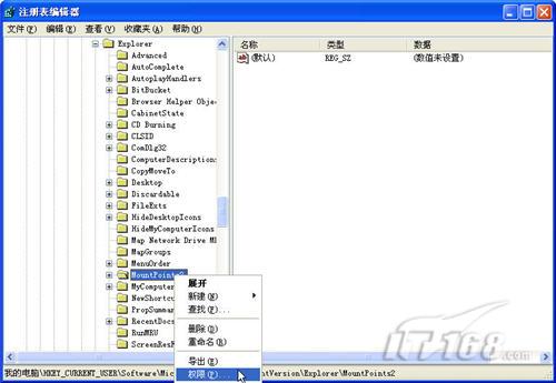 第三步:在鍵MountPoints2上點右鍵,選擇權限,針對該鍵值的訪問權限進行限制。(如圖8)