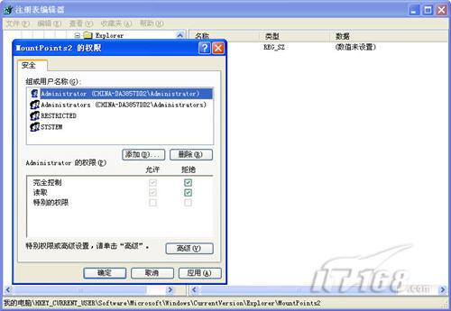 本操作的工作原理是 —Windows讀取Autorun.inf后,會修改MountPoints2下的子鍵以添加新的右鍵菜單項(xiàng)。將這個(gè)鍵的權(quán)限設(shè)為阻止,指向病毒的菜單項(xiàng)無法出現(xiàn),病毒自然也就不能被激活了。
