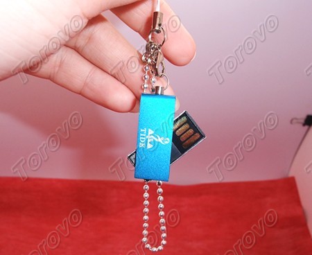 此款迷你旋轉U盤,超小的造型僅比USB接口大出少許,突出了輕、薄、小的產品特色。U盤的整體外觀小巧可人,其材質運用也非常出色,堅硬的金屬外殼配以時尚絢麗的顏色。U盤還設計了特別的掛繩孔,能夠方便的掛在鑰匙鏈和背包上,以避免不慎丟失。
