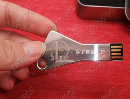 這款獨(dú)特的鑰匙U盤采用了無縫一體化設(shè)計(jì),避免了傳統(tǒng)U盤蓋帽丟失的煩惱,銀色的外表顯得U盤十分高貴時(shí)尚。U盤表面經(jīng)過不銹鋼拋光處理,刻有激光鐳雕logo圖案。