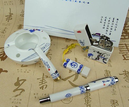配置:青花瓷筆+青花瓷U盤(可自由選筆圖案和U盤的大小)+打火機+煙嘴+煙灰+禮品盒+手提袋
