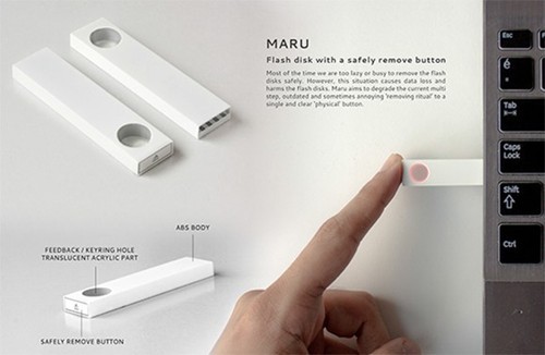 這款U盤是由一位名叫Ahmet Burak Aktas的網(wǎng)友設(shè)計。其外形看起來跟普通U盤相差不大,但是尾部處有一個按鈕,使用完之后,按一下就可以從電腦彈出,直接就可以拔掉。