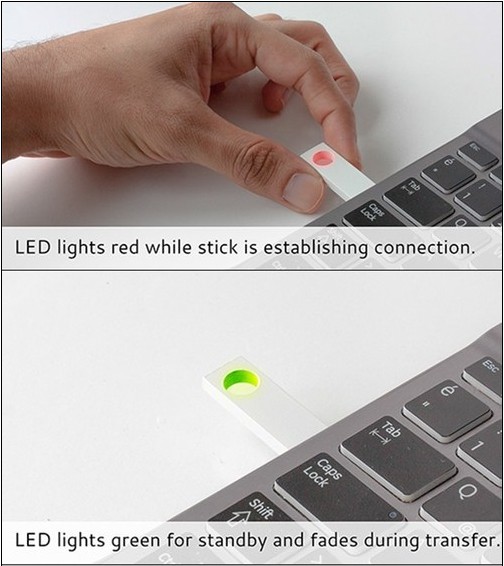 這款U盤還有一個圓形指示燈,會發(fā)出紅色或綠色的光。當(dāng)插入U盤時,紅燈亮表示正在建立連接;在數(shù)據(jù)傳輸過程中,綠燈則不停的閃爍;在按下彈出按鈕時,紅色會亮,然后就能安全取出U盤,之后燈則會熄滅。