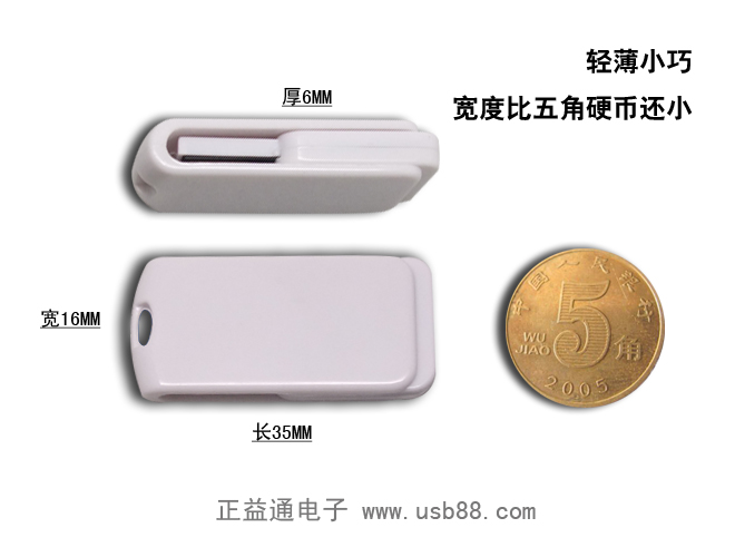 下面是這款旋轉U盤的尺寸大小,跟五角硬幣相比,寬度還要比硬幣稍小一點。